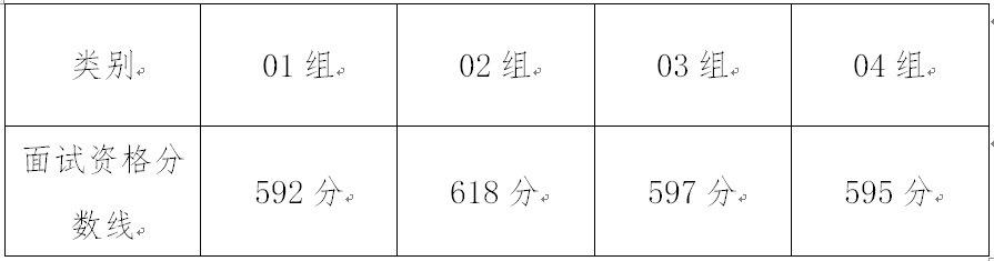 面试资格分数线按报考考生从高分到低分排序,排除不符合报考条件的考生后,分组按计划数1:2的比例划定,具体资格分数线如下: