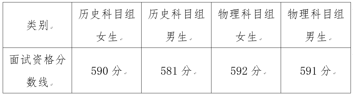 面试资格分数线按报考考生从高分到低分排序,排除不符合报考条件的考生后,分组按计划数1:2.5的比例划定,具体资格分数线如下: