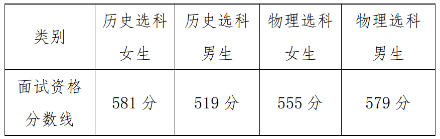 面试资格分数线按报考考生从高分到低分排序,排除不符合报考条件的考生后,分组按计划数1:2.5的比例划定,具体资格分数线如下: