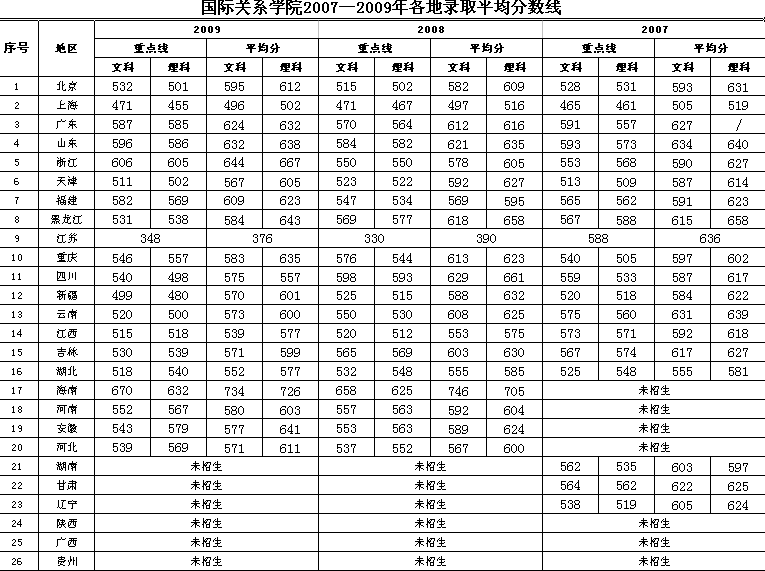 国际关系学院2007-2009年各地录取平均分数线