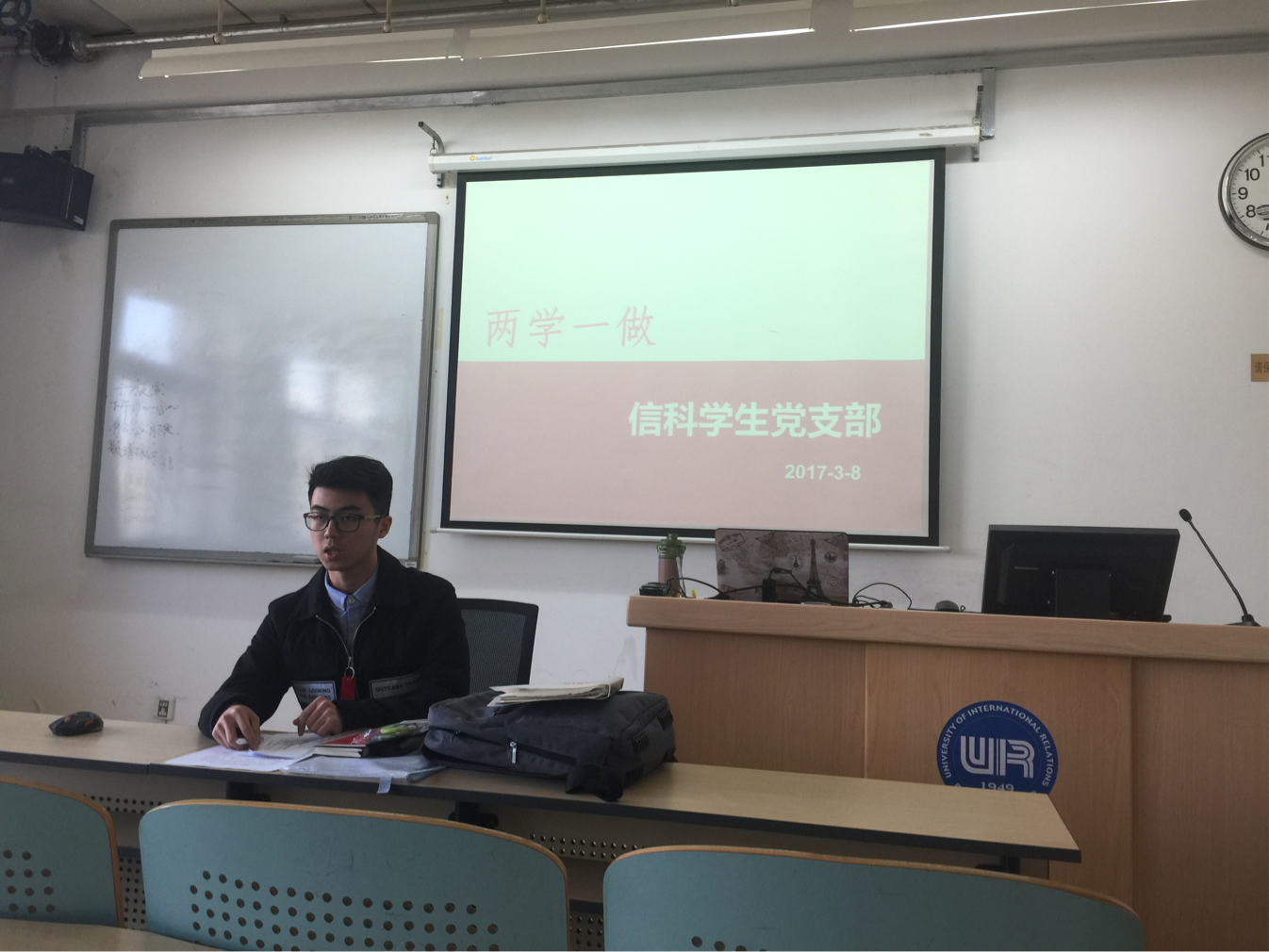 会议由学生党支部党员林弼远同学主持。会议的第一个环节是分享“两学一做”学习心得体会。首先发言林弼远同学讲述了自己 “如何学习党章党规”、 “学习系列讲话”,讨论了“什么是合格党员”,同时分享了自己在践行“两学一做”的体会和感受。