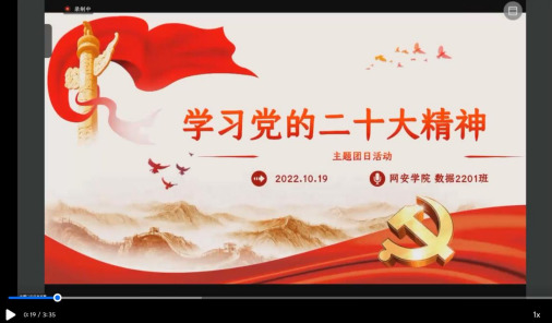 中国共产党第二十次全国代表大会,是一次举国关注、举世瞩目的盛会,其隆重召开令人心潮澎湃。习总书记报告向我们展现了过去五年的工作和新时代十年的伟大变革,党和国家事业取得历史性成就、发生历史性变革,推动我国迈上全面建设社会主义现代化国家新征程,开辟马克思主义中国化时代化新境界,以中国式现代化全面推进中华民族伟大复兴。在二十大会议中,特别提到了新时代对青年和青年工作者的期望和要求,为引领广大团员青年持续、深入学习党的二十大精神,网络空间安全学院各团支部开展了“学习党的二十大精神”的主题团日活动。本次活动主要通过线上线下会议的方式举行,各支部团支书围绕二十大的主要内容、中心思想等方面展开,主题团日活动顺利圆满开展。