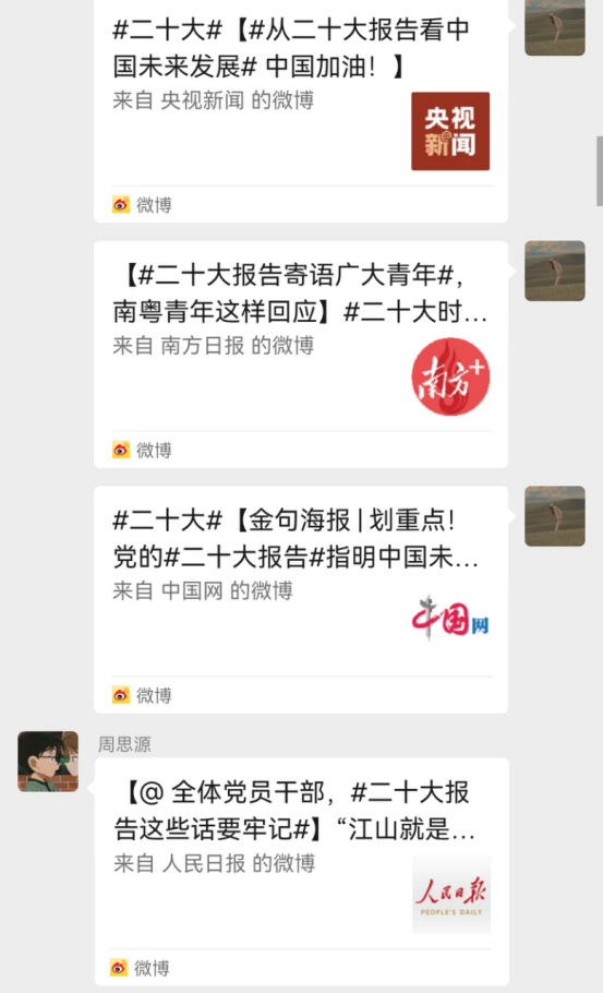 2022年10月18日,信管19团支部开展了“党的二十大”主题团日活动,由于疫情及毕业年级同学无法同时在校等原因,本次活动在线上通过微信进行,同学们积极分享自己对于二十大的学习内容,包括官方发布的解说、笔记等等。