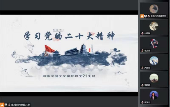 2022年10月20日晚,网络空间安全21支部开展了“学习党的二十大精神”主题团日活动。本次活动采取腾讯会议形式开展,会议内容紧紧围绕习近平总书记在大会上做的报告内容展开。团支书朱禹丹用一张二十大报告思维导图向大家介绍报告的主题以及各主要方面的内容,支部全体成员共同学习了全面建设社会主义现代化强国的战略安排,并对报告中提到的重点内容进行学习,如“一个中心任务”、“五项重大原则”等。会议中团支部学习了报告中的“金句”,并交流个人学习感受,朱禹丹分享到:山川湖泊、大国重器里都藏着每一个中国人拼搏的样子和对这片土地深沉的爱,每个人都是新时代“千里江山画卷”的绘就者,我们如今所取得的成就都是党带领人民一同拼搏和奋斗出来的。最后,支部共同学习习近平总书记在报告中对广大青年的嘱托,更加坚定“听党话、跟党走”,更加明确个人学习和奋斗目标,努力做有理想、有担当、能吃苦、敢作为的优秀青年!