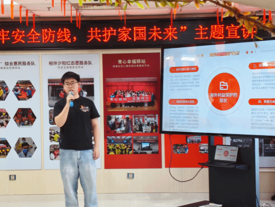 2025年4月15日下午,在第十个全民国家安全教育日到来之际,网络空间安全学院学生党支部前往青龙桥志愿服务促进中心开展宣讲活动。活动以“筑牢安全防线,共护家国未来”为主题,由五名学生志愿者担任主讲人,分别从海外利益安全、军事安全、生物与粮食安全、数据安全、文化安全五大领域切入,结合案例分析、知识问答和互动讨论,为现场观众呈现了一场内容丰富、形式生动的国家安全教育课。