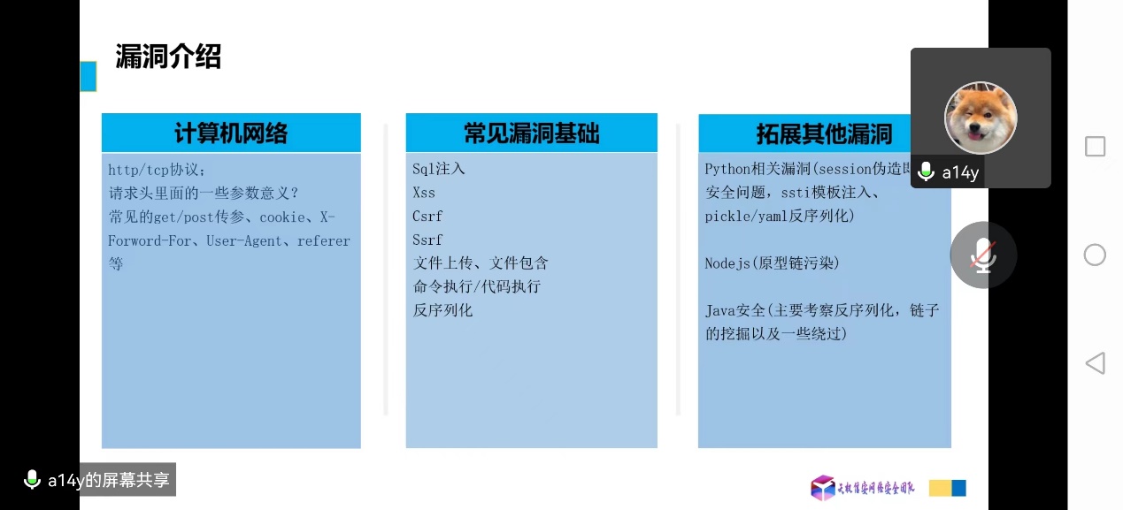 讲座的主要内容包括但不限于国内网络安全形式严峻,网络安全今后的发展,常见的安全漏洞及其复现,如何自己挖掘网络安全漏洞等。