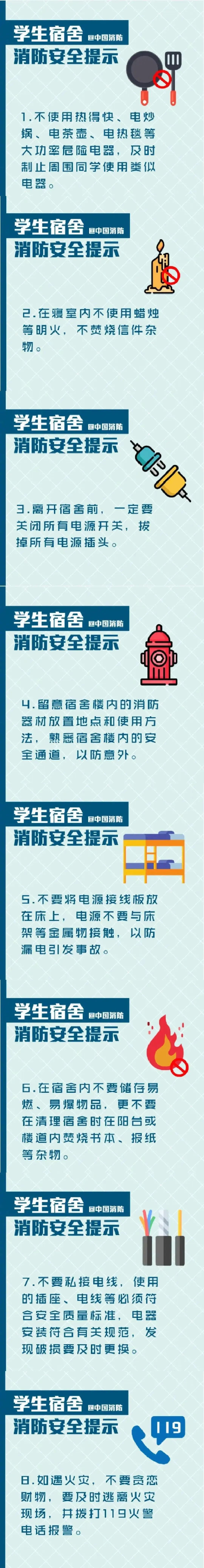 同时秋冬季节,天气愈发干燥,宿舍安全隐患也随之增加,尤其是火灾事故的预防需要同学们注意,一定要杜绝使用违规电器、易燃易爆危险品、私拉乱接电线的生活习惯!