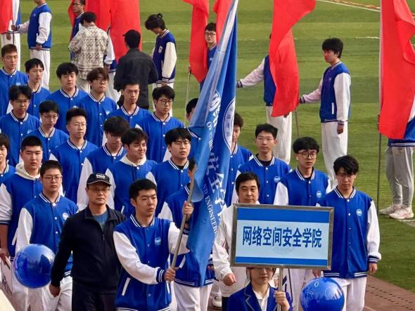苍穹之下露锋芒,势如破竹不可挡。网安学子们步伐坚定,眼神透露光芒,人人手持字母牌,组合成一块键盘板,挖掘数据、编码破密,键盘不仅是我们学习的工具,更是师生们于无声处戍卫网络安全的武器。今天站上运动赛场,我们意气风发,我们蓄势待发,网安网安,天下为先!