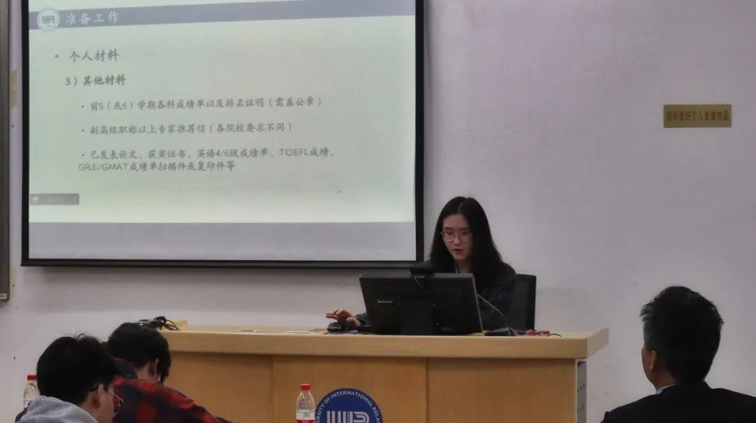 刘宇老师就留学前申请的必要条件及需要做的准备做了具体解释,并总结道,出国留学是一个漫长充实自己的过程,需要多花时间去做准备。就读于美国卡内基梅隆大学的吴昊雯师姐也对于出国的硬性要求、文书准备等方面给出了自己的建议。