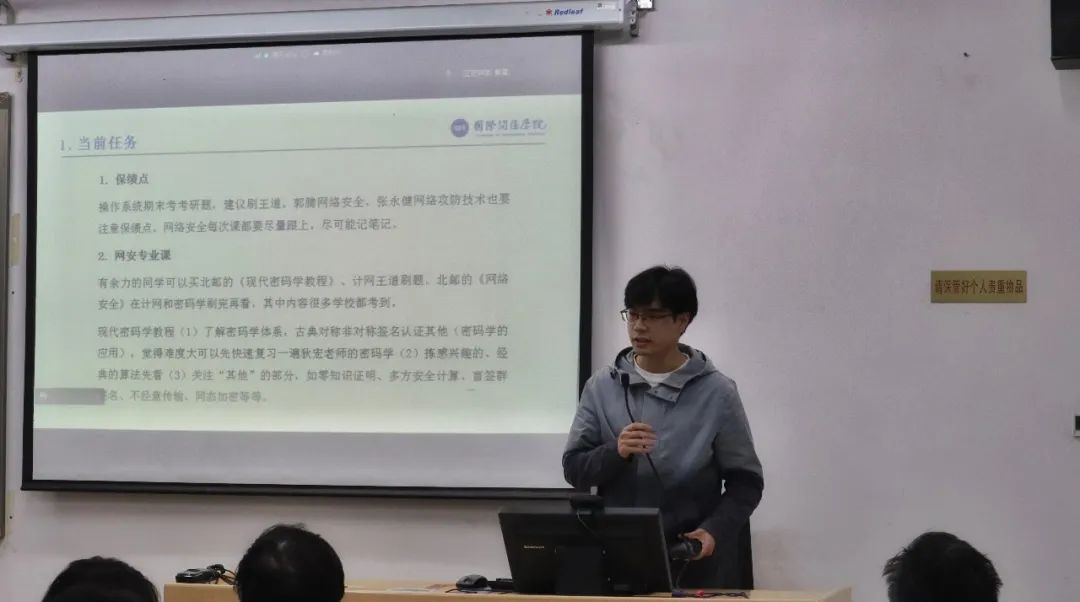 活动结束之际,网络空间安全学院党总支副书记朱小京老师与辅导员贾卫城老师也对整个活动周进行了总结。他们建议大家结合个人情况确认未来发展的规划,并代表网安学院,对来分享的师哥师姐们以及活动组织人员表示感谢。此次职业周活动极大地拓展了学院学生们的信息获取渠道,有效地帮助了同学们结合自身情况做出决定。同时,也祝愿同学们能够通过此次活动提高自身职业生涯规划的能力,把理想落到实处,认清自我、找准方向,为日后的道路做好准备,不坠吾辈青云志!