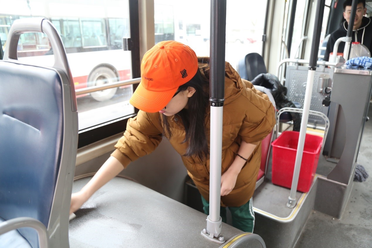 因为工作较为复杂,活动开始后,同学们结成小组,分组完成清洁工作。有的负责擦车顶,有的负责拖地,有的清理车的座位、扶手、窗沿及各个死角。