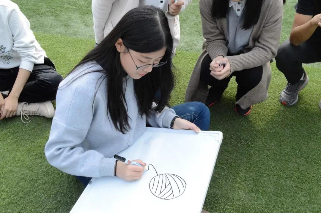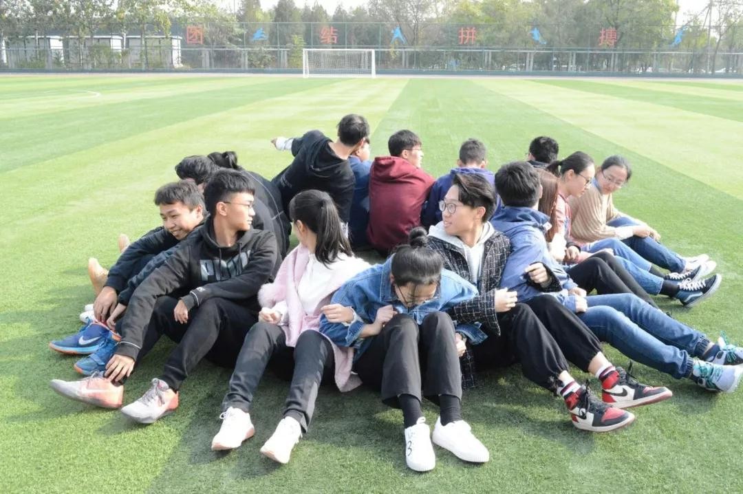 第一个项目为坐地起身。所有人分为三组,背靠背手挽手围成一个圈然后努力站起来。这个游戏考验大家的团结协作能力,过程虽然艰辛,但在互相帮扶下起立后,绿茵上又响起一片欢腾的掌声。欢声笑语在蓝天下的绿茵场上荡漾。青穹云散,碧原笑集,此秋来日当忆。