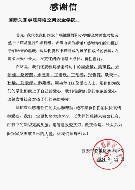 为了关怀和激励乡村儿童,照亮他们求学的道路,帮助他们健康成长,11月14日至20日,网络空间安全学院与“环益童行”项目组联合举办了“益暖童程,逐梦远方”公益主题活动。近200名学生参与其中,期望通过这一活动,让乡村儿童深切感受到社会的关爱,帮助他们在知识的滋养下茁壮成长,并且能够坚定而勇敢地追逐自己的梦想。