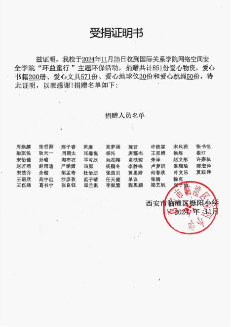 根据“环益童行”项目组的反馈,当爱心物资送达西安市临潼区栎阳小学的孩子们手中时,他们脸上洋溢着难以掩饰的喜悦。我们衷心感谢每一位参与活动的同学和朋友,正是你们的热心公益让这份喜悦得以实现。每一份微薄的贡献,都汇聚成孩子们成长道路上的强大力量,让他们感受到社会的温暖和关爱。这份爱心将永远伴随着他们,成为他们前进道路上的坚强后盾。在此,我们再次向所有参与者致以最崇高的敬意和最诚挚的感谢。