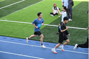 赛道铺开青春的五线谱,少年屈膝蹲踞如满弓待发。当发令枪撕裂空气,他们化作带电粒子迸发流光。蓝天为幕,呐喊作鼓,每道汗湿的脊背都在书写:追风者从不计算风速,只把青春跑成闪电的形状。