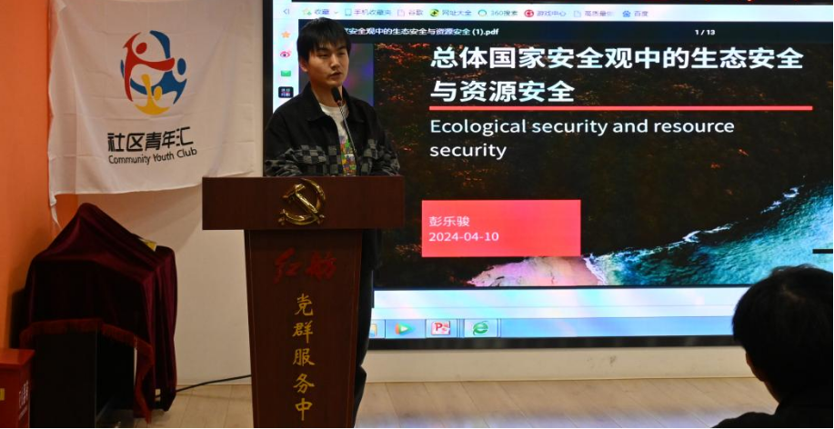 第一位主讲人是彭乐骏同志,他从国家安全中的生态环境与资源安全展开,介绍了生态安全和资源安全的基本理论知识以及二者之间的联系。通过他精彩的宣讲,大家了解到目前我国的生态环境面临着土地退化、生态失调、植被破坏等一系列的问题。而资源安全的维护又关乎于良好的生态环境。因此,他从国家安全的长远考虑出发,呼吁大家都应将“保护环境,节约资源”的理念付诸于实践,守护身边“青年亦可为”的国家安全。
