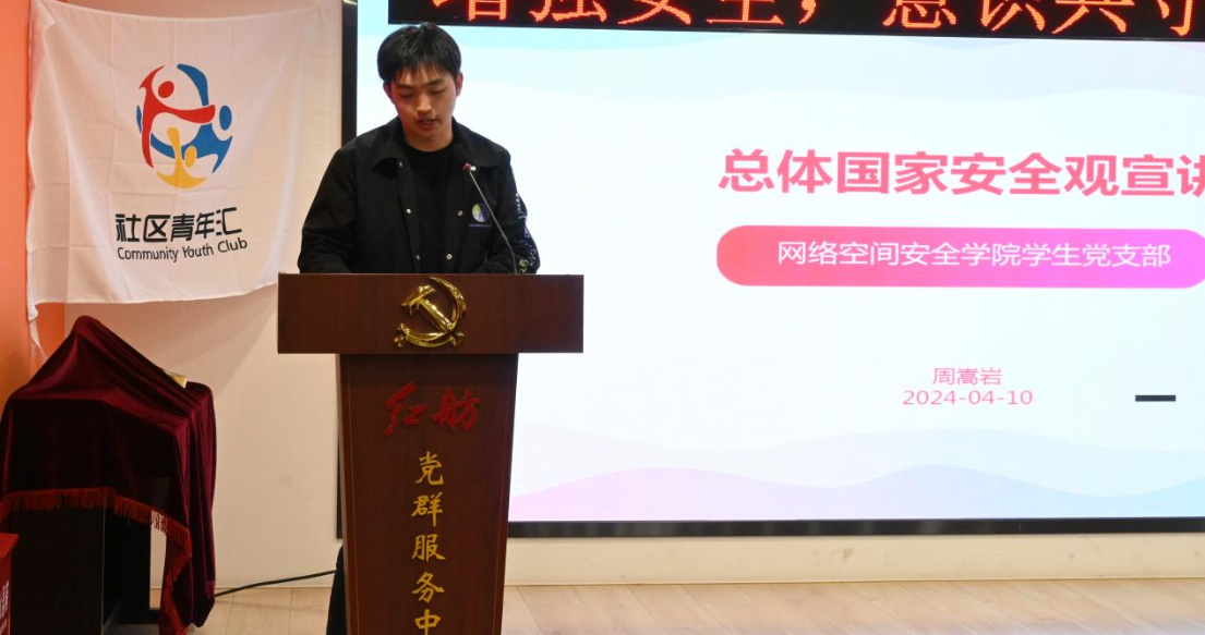 在第九个全民国家安全教育日到来之际,2024年4月10日下午,网络空间安全学院志愿队走进青龙桥街道红舫党群服务中心,面向青年群体开展了一场“增强安全意识,共守国家安全”主题宣讲活动。来自网络空间安全学院学生党支部的四位党员同志围绕总体国家安全观,宣讲了国家安全理论的主要内容,帮助青年们了解什么是国家安全,国家安全包括哪些方面,引导青年们牢固树立总体国家安全观,切实提高安全防范意识和自我保护能力。