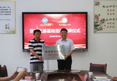 我校实践小组首先前往河北省盐山中学,与该校签订“优质生源基地”协议,盐山县副县长刘英杰、盐山中学校长张东峰、校党委书记张吉胜、副校长郝国胜参加了签约仪式。河北盐山中学系我校党建帮扶对接学校,协议签订适值盐山中学建校100周年,两校期冀以此为契机,不断加强协作,提高教学、教研水平,拓宽国际国内视野,增强为党育人、为国育才的责任感、使命感,共同实现高质量发展。