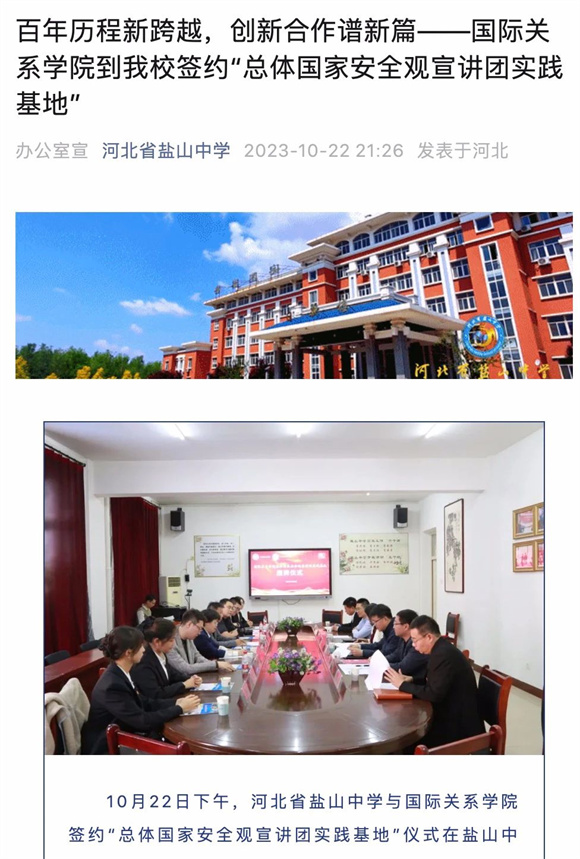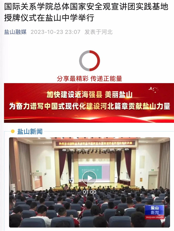 10月22日,“国际关系学院总体国家安全观宣讲团实践基地”挂牌仪式在盐山中学举行。