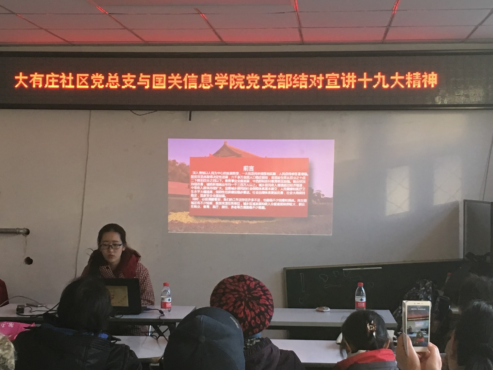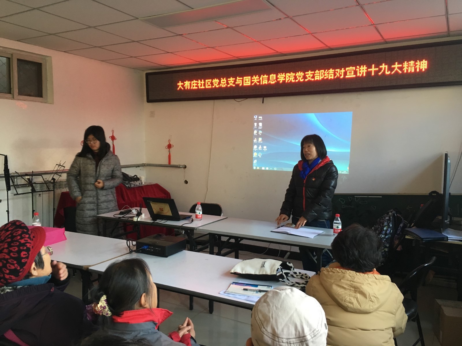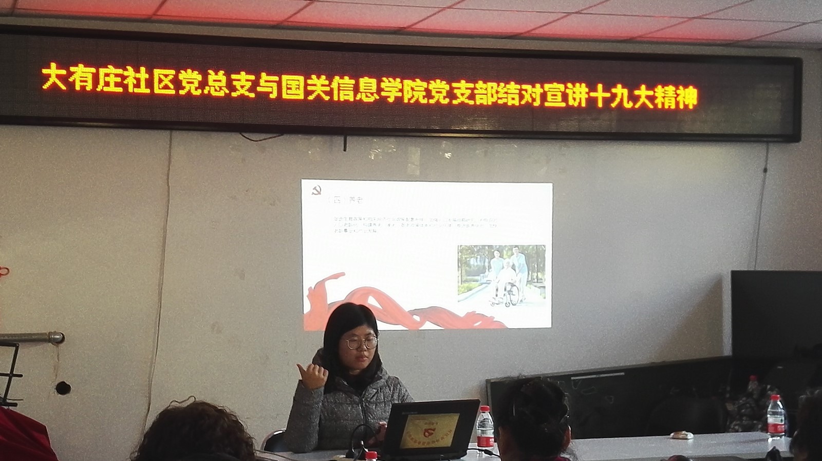 12月11日下午,网络空间安全学院学生党支部的同学来到青龙桥街道大有庄社区,和社区居民们举行“红色1+1”结对宣讲十九大精神的活动。大有庄社区党社区书记非常热情地接待了到来的同学,向同学们介绍了社区基本情况。同学们也通过PPT宣讲的方式,将自己学习十九大精神的心得与思考,和社区爷爷奶奶们作了交流。