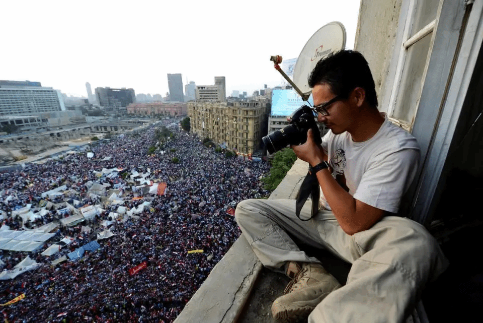 2013年7月3日,新华社记者、英语专业2005级本科生李木子在埃及开罗解放广场采访。