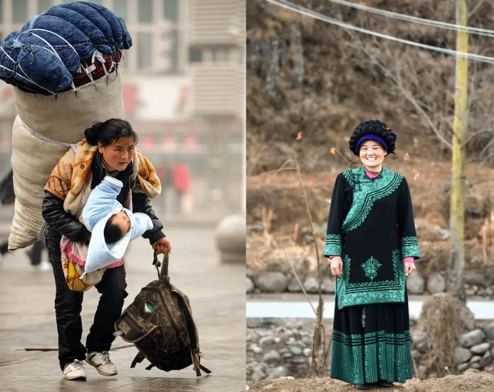 2010年1月30日,年轻的彝族母亲巴木玉布木背负超大行李、怀抱孩子在江西南昌火车站匆忙赶车(左)。2021年1月22日,在四川凉山彝族自治州越西县瓦岩乡桃园村拍摄的身着彝族服饰的巴木玉布木。如今,她的家庭已经脱贫,一家人日子越过越好(右)。新华社记者 周科 摄