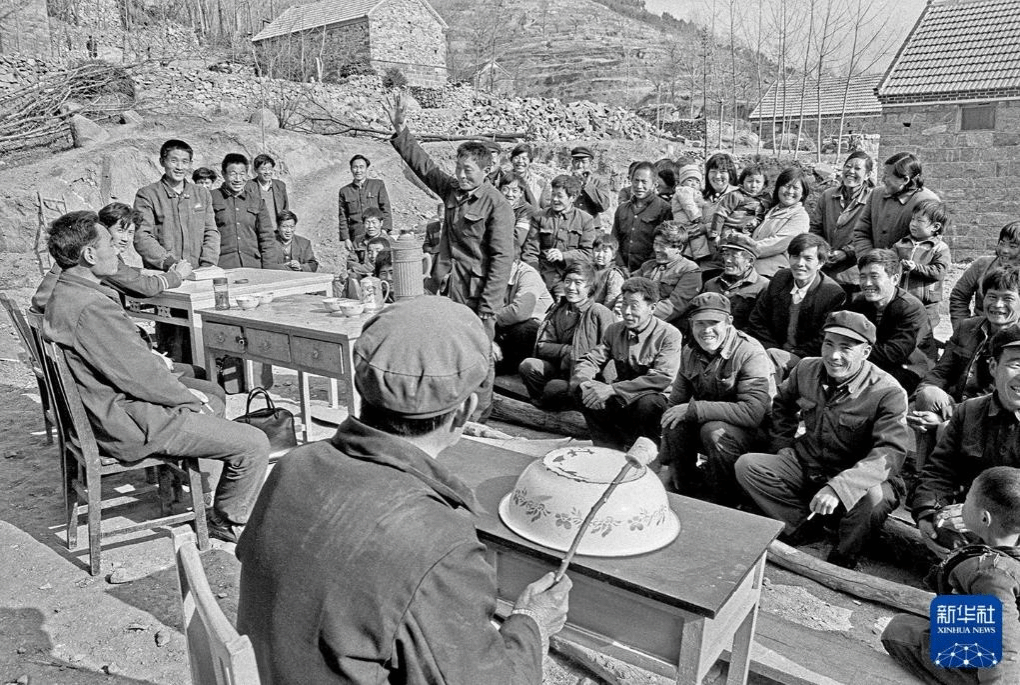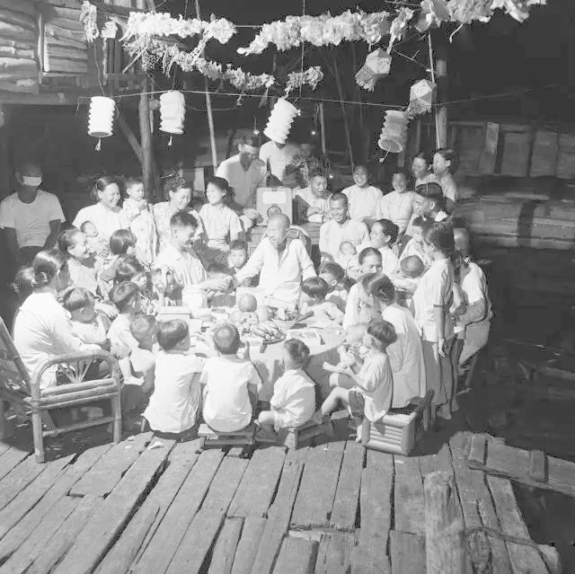 20世纪50年代,81岁的老渔民郭汝一家四代同堂共55人在中秋节夜大团聚,欢度佳节(资料照片)。新华社发