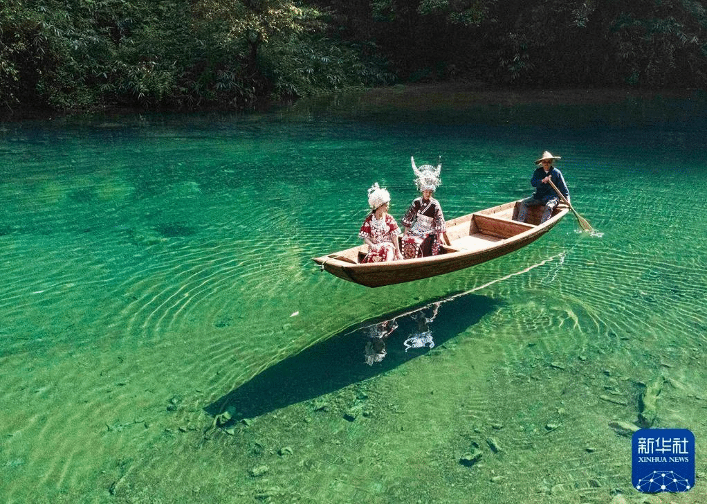 2022年3月15日,游人在湖北鹤峰县容美镇屏山村屏山旅游景区体验“悬浮船”。 新华社发(覃涛 摄)