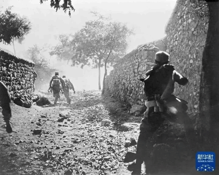 1948年6月,北平昌平县上下店子战斗中,人民解放军晋察冀三纵队摄影记者袁苓(右),在火线上拍摄战士们向国民党部队冲锋的情景。新华社发(郝建国摄)