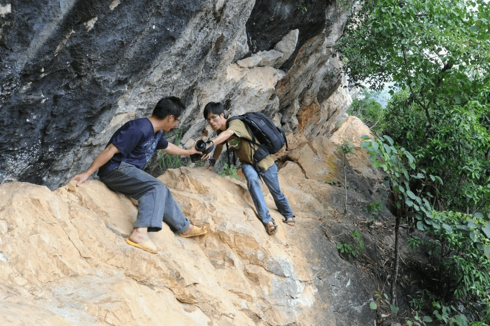 2012年9月3日,在广西大化瑶族自治县板升乡弄雷村,新华社记者黄孝邦(右)攀爬悬崖去采访。