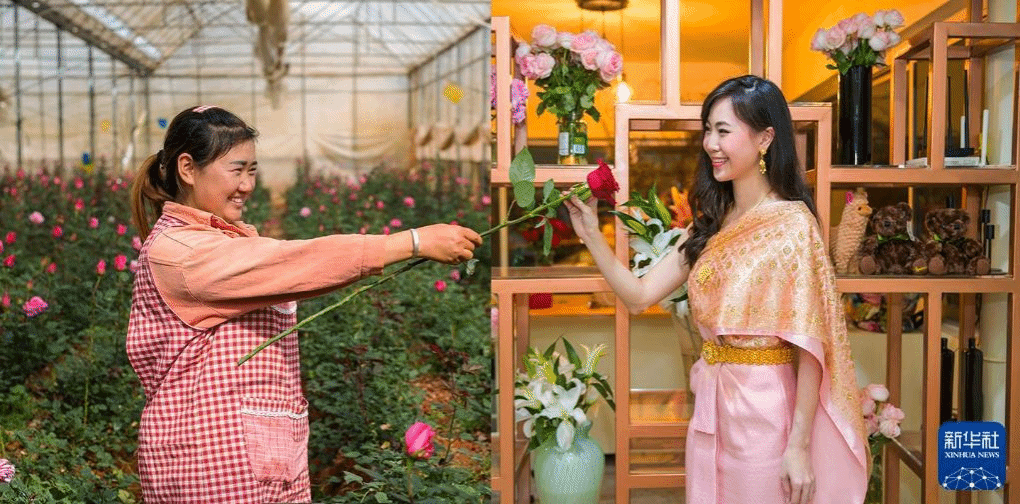 2019年2月,泰国曼谷的一名女士(右)“接过”云南花农“递出”的一支鲜花。(拼版照片,左图为新华社记者胡超摄,右图为新华社记者张可任摄)。