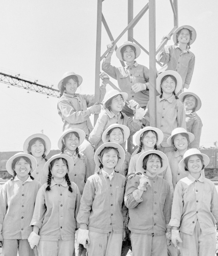 1975年7月,在四川参加宝成铁路电气化建设工程的铁道部电化工程局电化工程处四队一分队女工班的工人。新华社记者 吴祖政 摄