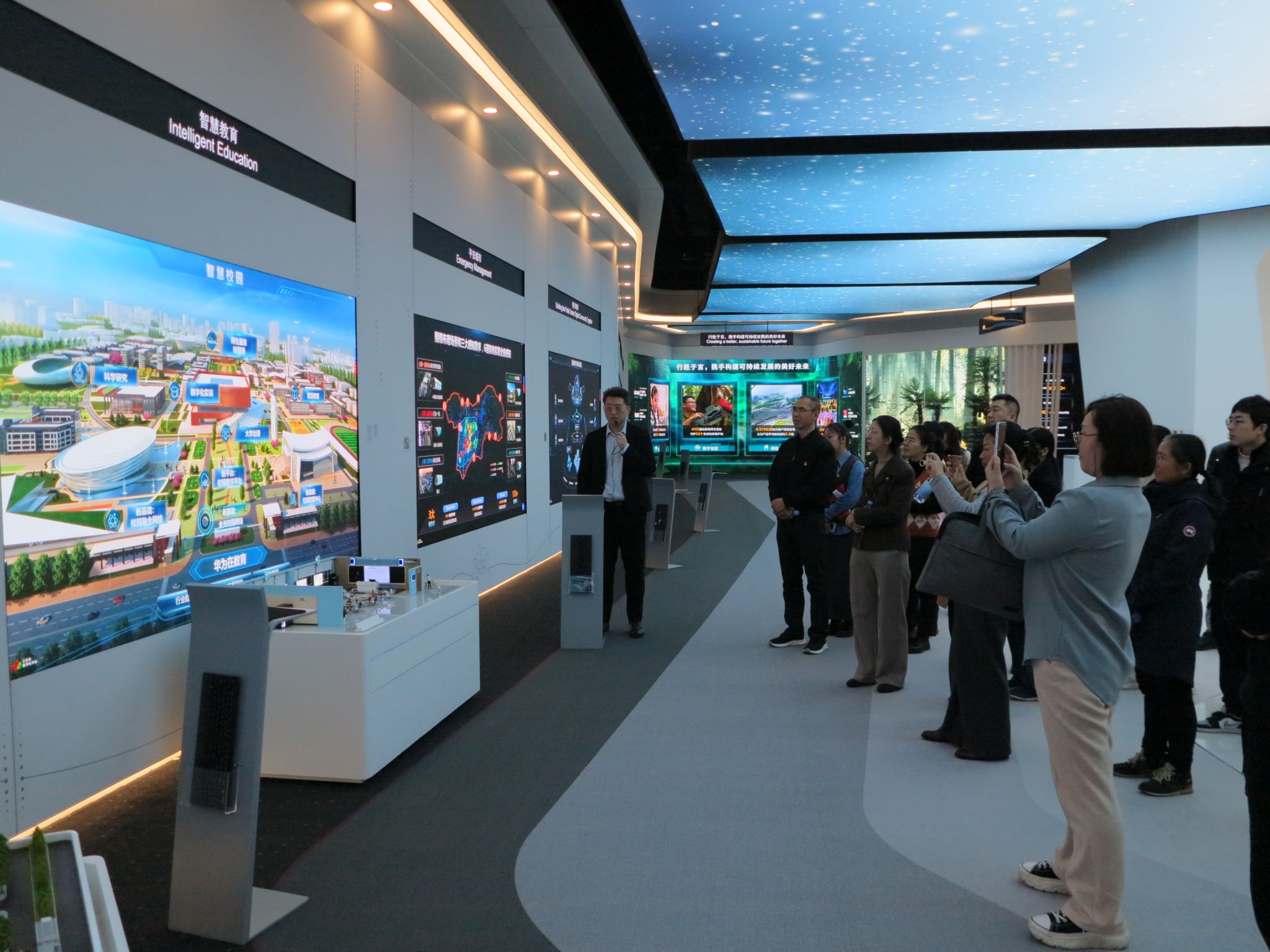 在华为展示中心,华为讲解员详细介绍了公司整体情况与业务,强调其在数字基础设施领域的卓越贡献,并阐述如何通过创新引领行业新价值。华为展示了面向行业智能化的领先产品和解决方案,以及强大的技术创新和行业影响力。华为致力于构建万物互联的智能世界,强化国家数字基础设施的“三化”支撑,推动城市治理体系智能化。