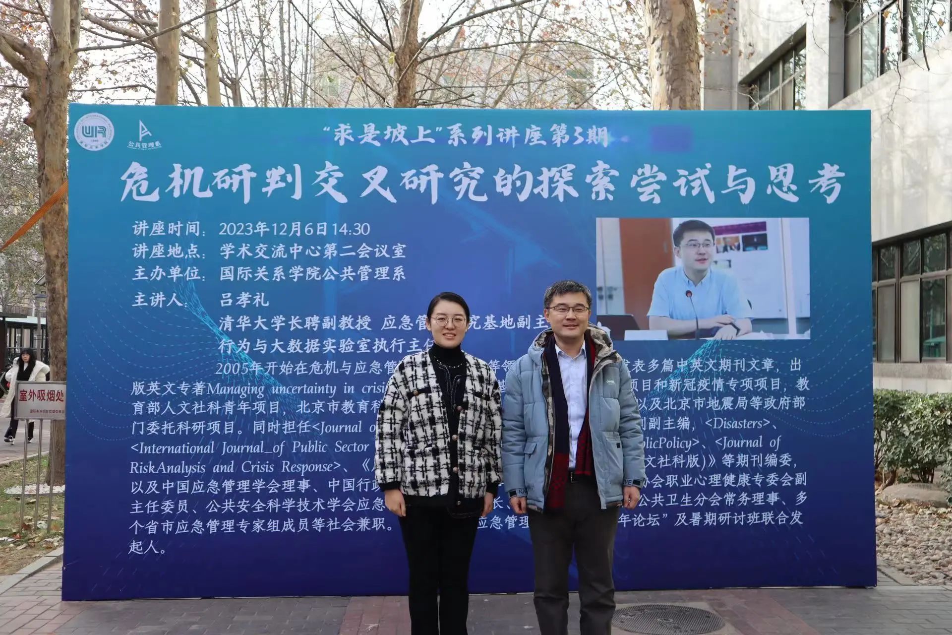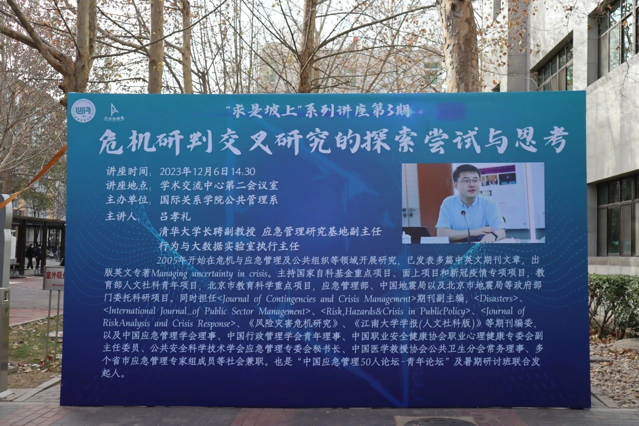 2023年12月6日下午,由公共管理系主办的“危机研判交叉研究的探索尝试与思考”学术讲座在我校学术交流中心第三放映厅如期举行。本次讲座特别邀请到清华大学长聘副教授吕孝礼教授,和大家分享关于危机研判交叉探索的研究与思考。国际关系学院公共管理系葛蕾蕾教授主持讲座,公共管理系师生参与讲座。