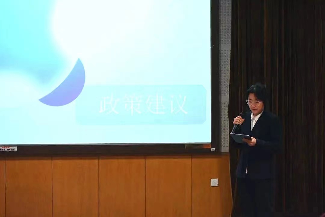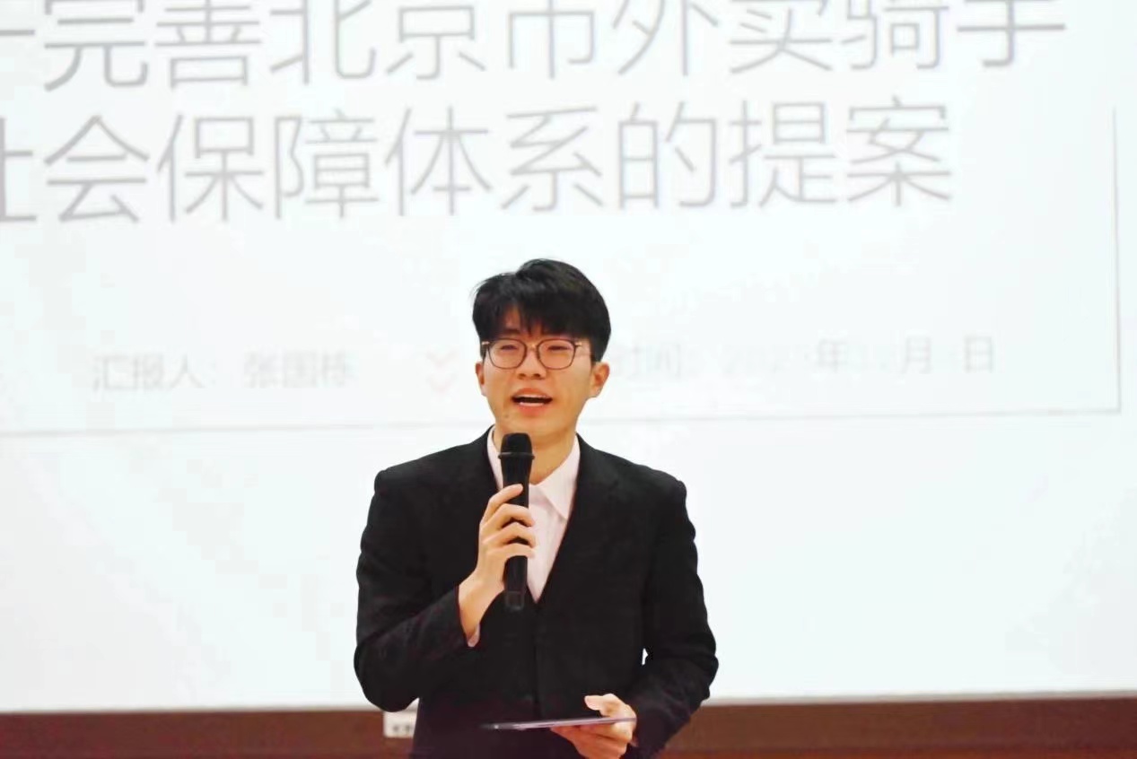 第一组张国栋、杨浩翔同学提出了关于完善北京市外卖骑手社会保障体系的思考。针对外卖骑手面临的社会保护问题及挑战,他们分析了外卖骑手的群体特征、探讨了提案意义并提出了可行方案。