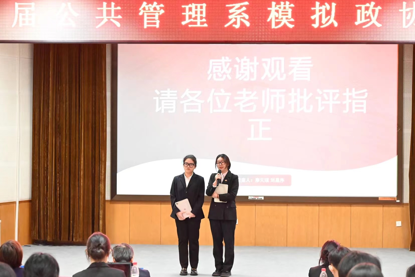 2023年12月8日,第二届公共管理系模拟政协提案大赛决赛在学术交流中心第二放映室成功举办,公共管理系尚水利教授、张潇爽老师、张体委老师、邢昌新老师和公共管理系团总支书记梁爽老师出席本次活动。