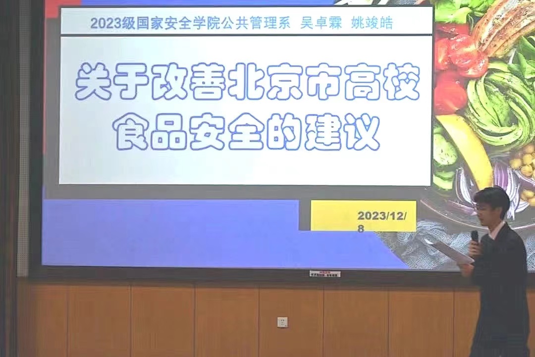 第九组吴卓霖、姚竣皓同学围绕当今高校校园普遍存在的饮食问题,提出了关于改善北京市高校食品安全的建议。他们从校内食品安全和校外食品安全两方面展开分析,提出了“加强从业人员管理及食品安全知识培训”“提升大学生食品安全意识”等相关建议。