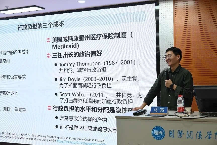 随着话题深入,马亮教授还介绍了行政负担的特征。他指出,行政负担是国家建构的刻意为之,其影响是深远的。同时,行政负担有三个成本:学习成本、服从成本和心理成本;行政负担的水平和分配是隐性政治,是刻意政治选择的产物而不是疏忽大意或偶然结果。