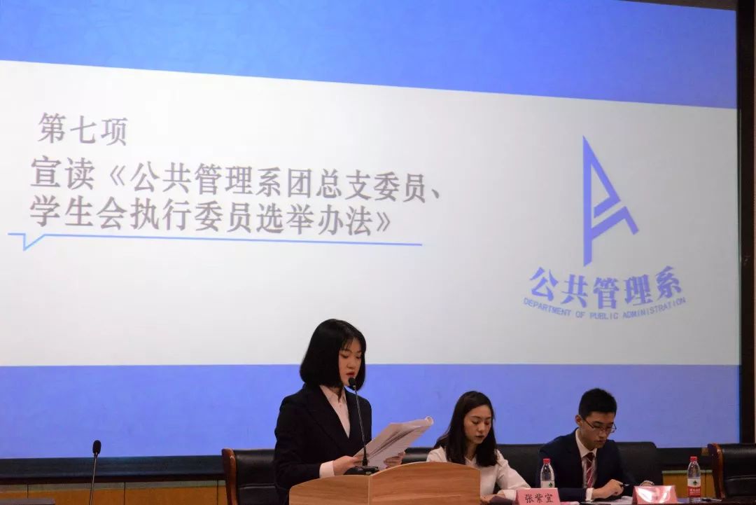 大会执行主席团成员保津、裴林林、陈昱睿分别宣读了《公共管理系团总支委员会、学生会执行委员会机构组成》、《公共管理系团总支委员、学生会执行委员选举方法》以及新一届团总支委员、学生会执行委员候选人资格审查报告。