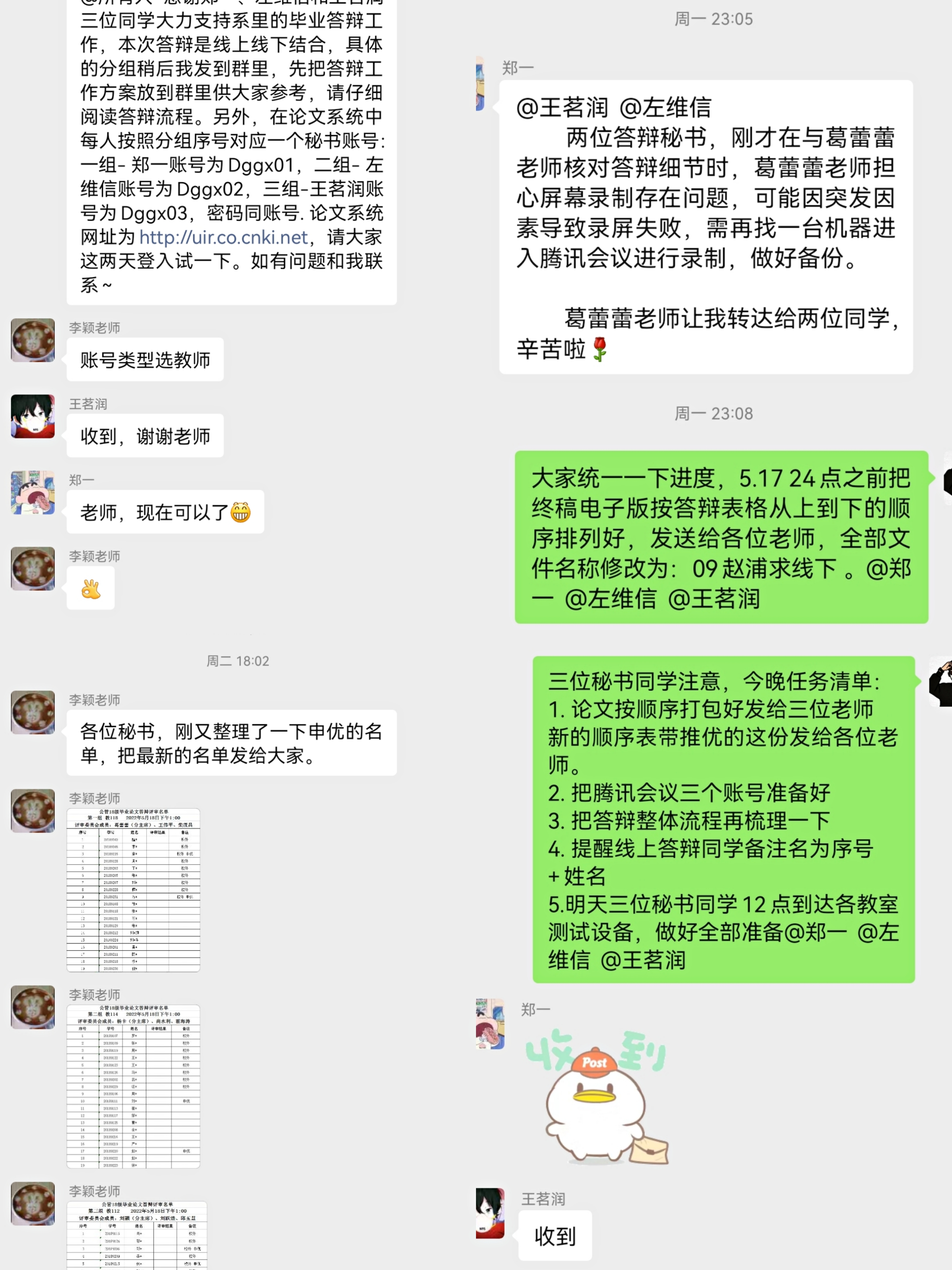 细打磨,梳理流程。举办线上线下混合形式的会议活动,流程中的细节是重中之重。学生干部和答辩秘书主动思考,对论文查看、总结综评、会议封面、录屏存储等答辩会议中的细节认真准备和设计。在杨华锋副主任和葛蕾蕾老师的统一组织安排下,各答辩组于答辩前敲定了每一处答辩环节。各位答辩秘书同学及时梳理和反馈,也在答辩前将流程熟记于心。