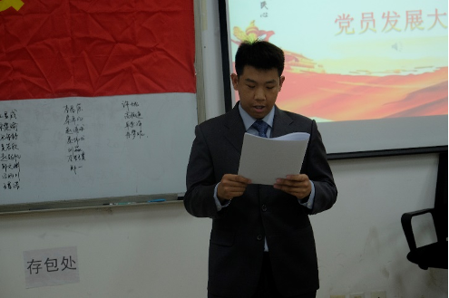 会议在激昂的国际歌中徐徐拉开帷幕,入党申请人同志依次上台宣读《入党志愿书》。同志们从不同的角度出发,汇报了自身对党的认识、入党动机及个人履历等方面。