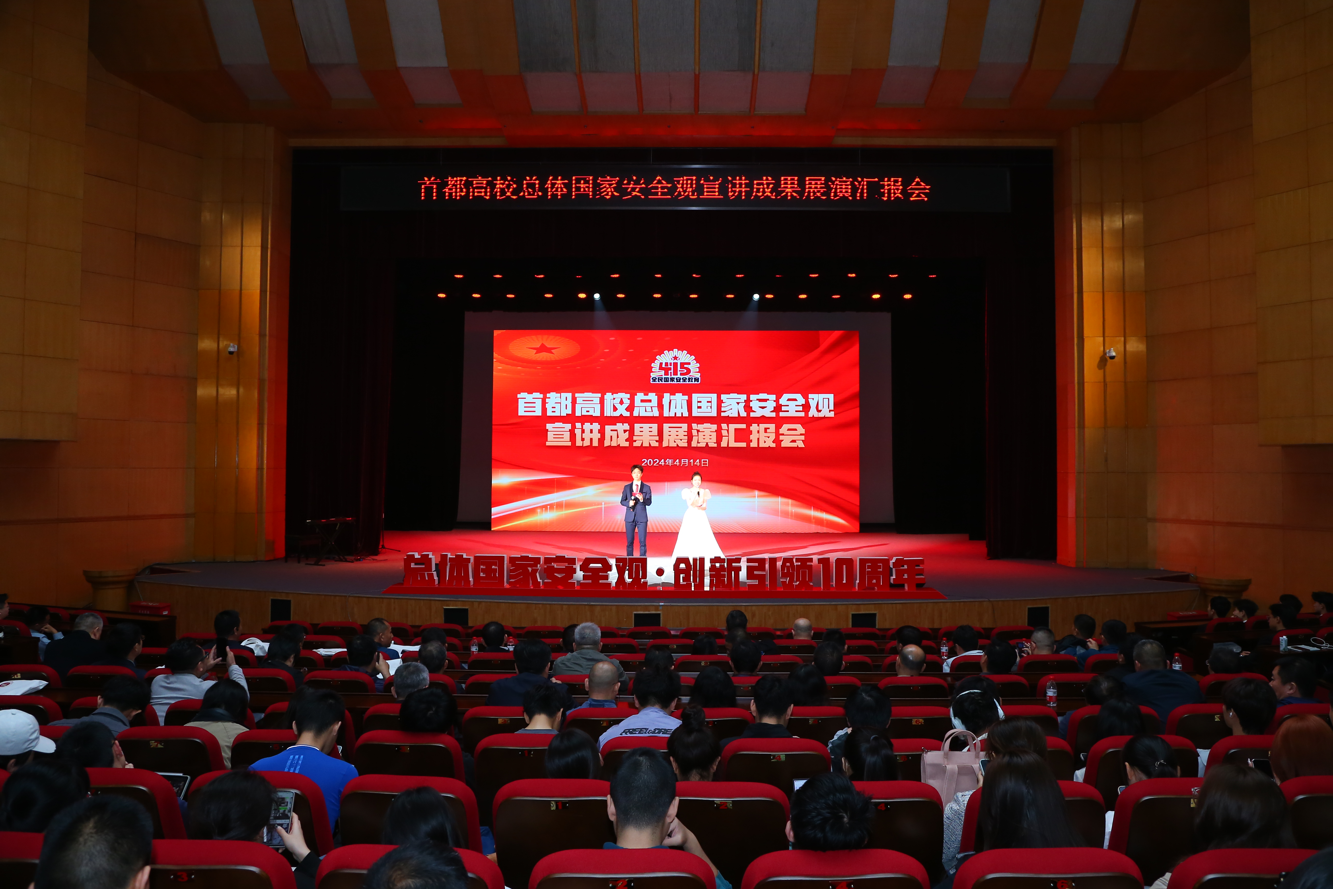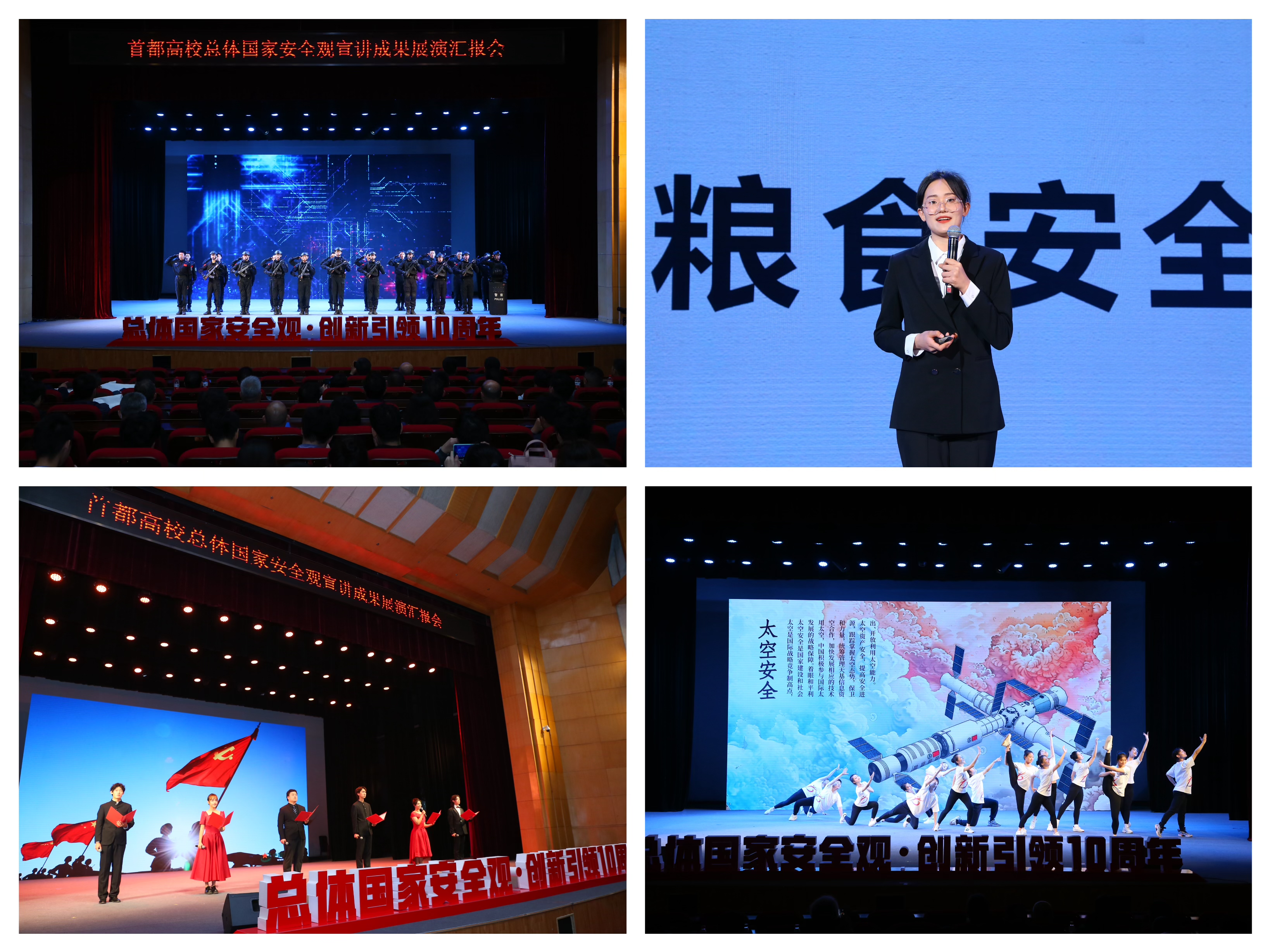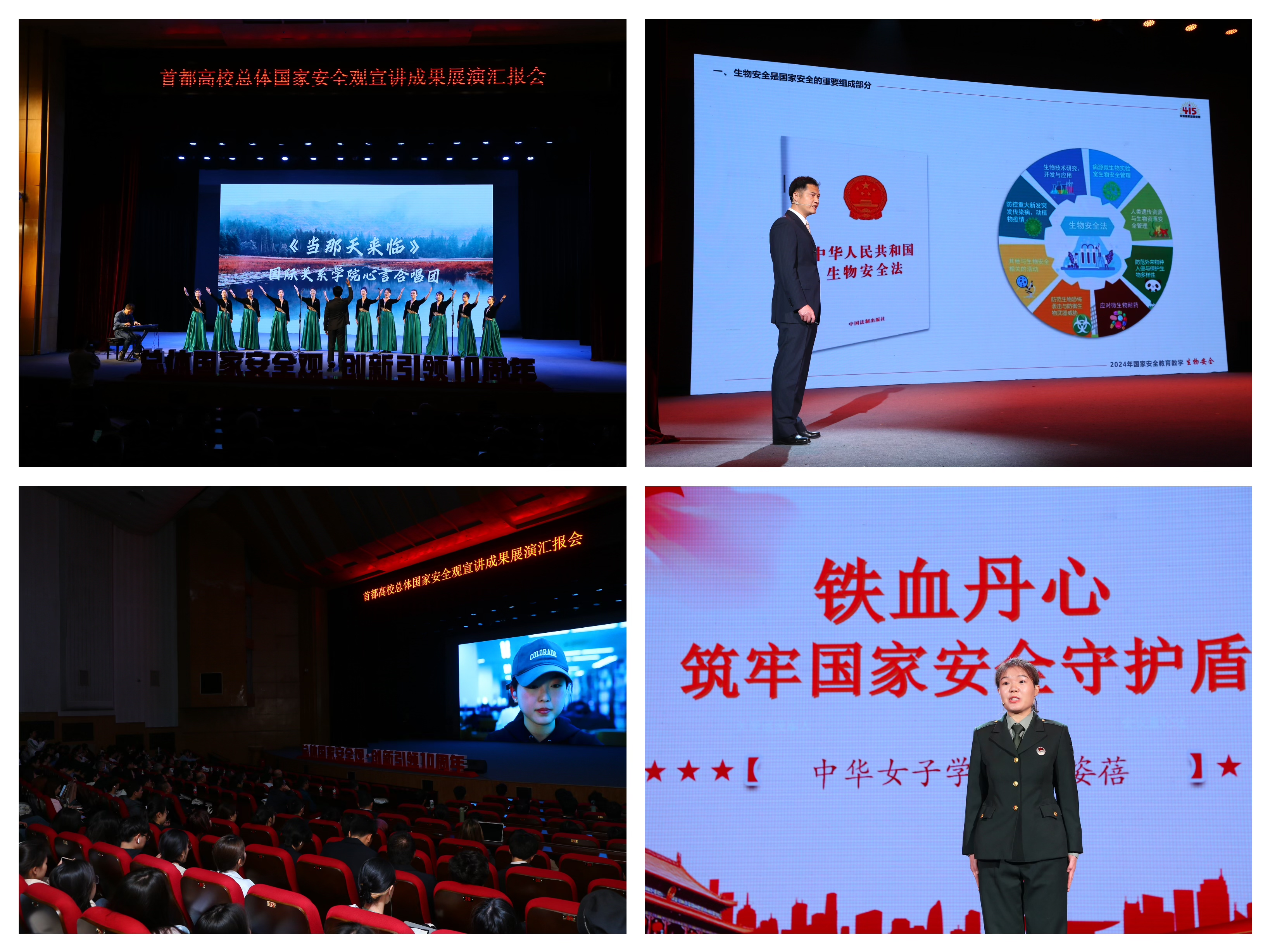 在总体国家安全观宣讲成果展演汇报环节,来自国际关系学院、首都体育学院、北方工业大学、中华女子学院、中国人民公安大学、北京工商大学、首都师范大学等高校的9个宣讲作品,以合唱、公开课、微电影、现场宣讲、诗朗诵、现代舞等形式全面呈现了首都高校优秀国家安全宣教成果,深度诠释了总体国家安全观提出十年来的重大理论和实践伟力。