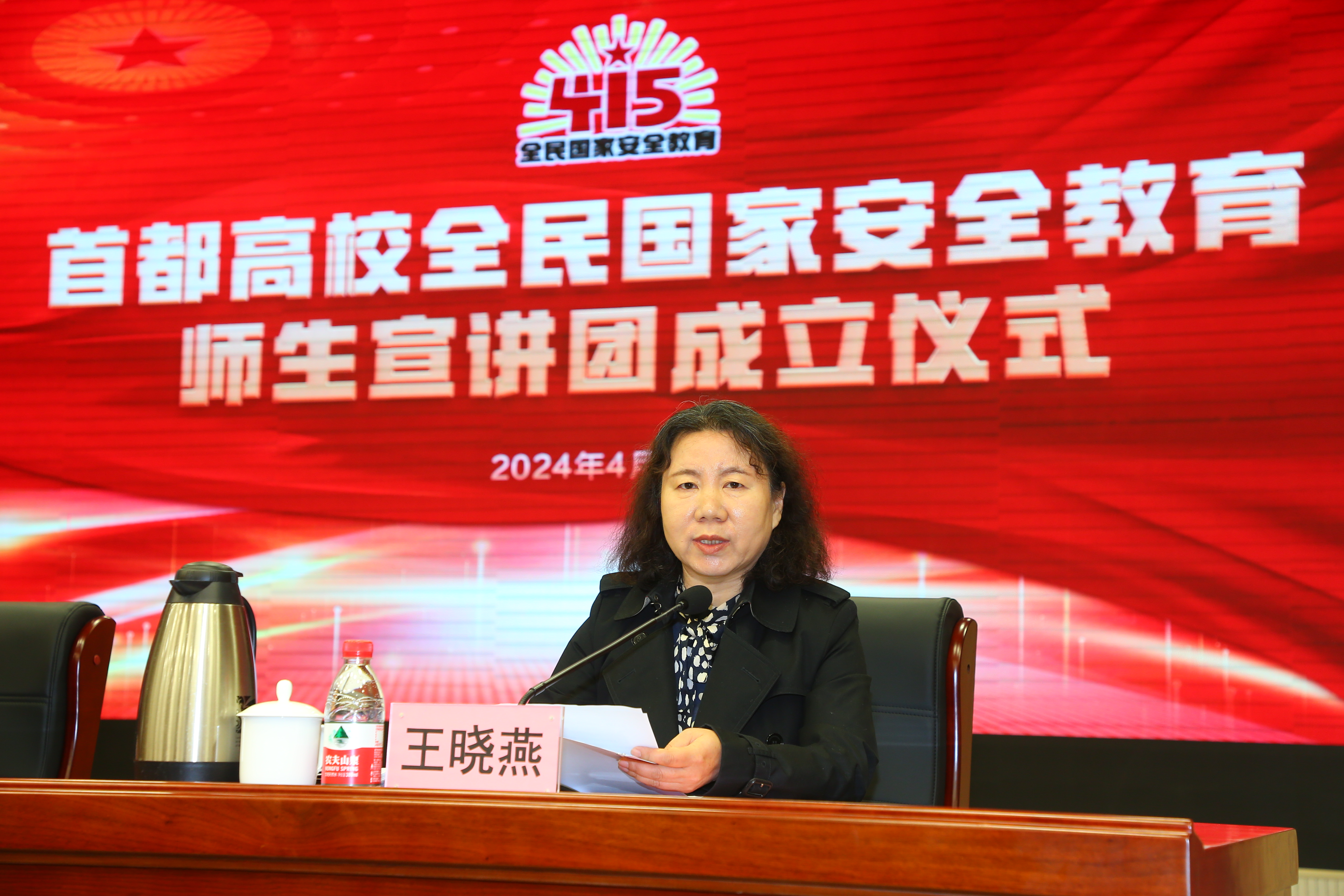 王晓燕代表北京市高等教育学会向首都高校全民国家安全教育师生宣讲团的成立致贺词。她指出,首都高校师生要发挥引领示范作用,走在学习、阐释、宣讲总体国家安全观的最前列。宣讲团要进一步丰富宣讲内容,创新宣讲形式,为推动全社会形成维护国家安全强大合力,作出新的更大的贡献。