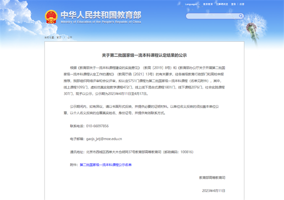 4月11日,中华人民共和国教育部发布《关于第二批国家级一流本科课程认定结果的公示》,我院王文华教授负责的《英汉语言对比研究与翻译》课程拟认定为第二批国家级一流本科课程,这是我院首次获评国家级一流本科线下课程。此前,我院已有5门课程被认定为国家级精品在线开放课程和首批国家级一流本科课程。
