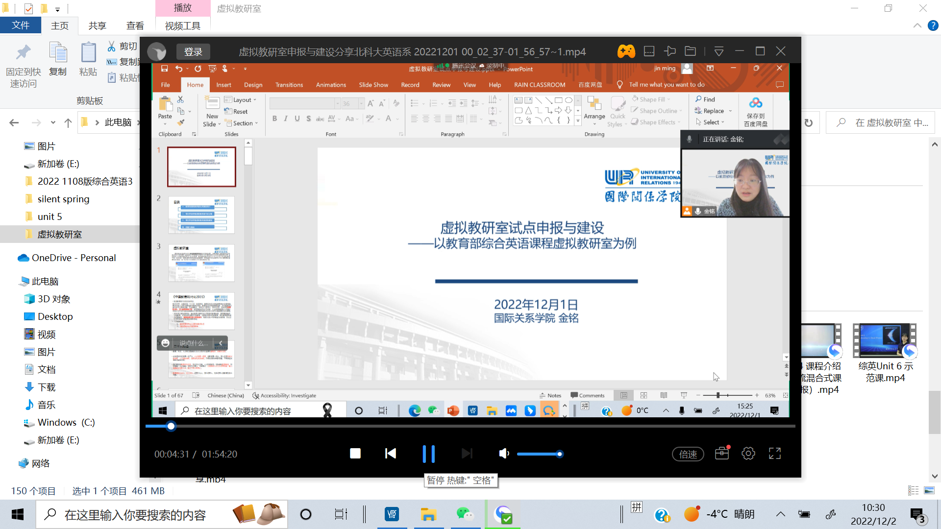 2022年12月1日下午,教育部综合英语课程虚拟教研室负责人金铭副教授应邀为北京科技大学外国语学院英语系20位教师做了题为“虚拟教研室试点申报与建设—以教育部综合英语课程虚拟教研室为例”的讲座,综合英语课程虚拟教研室成员李亚丽副教授、谢葵副教授也参与了本次活动。