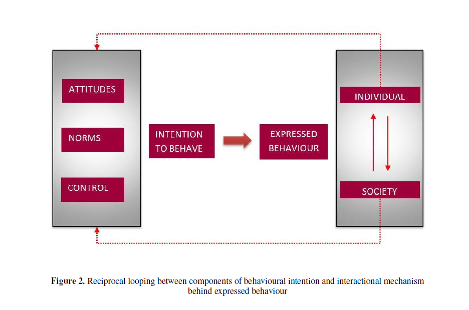 Parmak博士还展示了行为意愿(intention to behave)与行为表达(expressed behaviour)背后的交互机制之间的互惠循环关系(reciprocal looping) (见上图)。个人和社会的互动不会直接影响行为,但会间接影响行为意愿的心理组成部分(态度、行为规范、控制)。互惠循环整合了环境结果和行为因果关系。实线箭头表示可直接观察到的过程,虚线箭头表示不能直接观察到的心理过程。