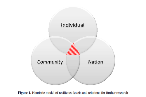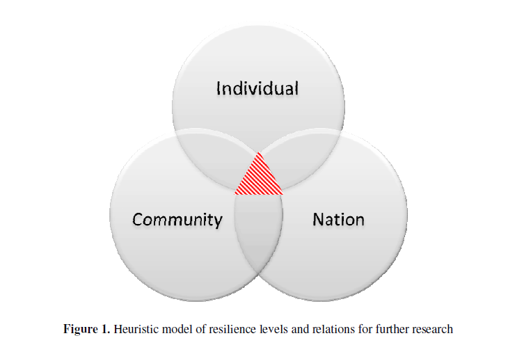 Parmak博士通过个人、社区、国家三个层面的韧性和三者关系的启发模型来模拟个人特质(个体层面)、文化因素(社区层面)、政治体系中的公民权利(国家层面)三者之间的韧性挑战(见上图)。个人与社区关系中的风险在于可能失去稳定性和舒适性,社区与国家关系中的风险在于可能失去有价值事物,个人与国家关系中的风险在于可能违背根深蒂固的价值观。每种关系中的两个变量大多时候呈正相关,比如个人韧性越强,社区韧性越强,反之亦然。但也有例外的情况,比如大众群体(general population)的社区韧性与国家韧性可能呈负相关,即社区韧性越强,国家韧性越弱,潜在的解释是这个社区没有很好地融入国家(community not integrated in nation).