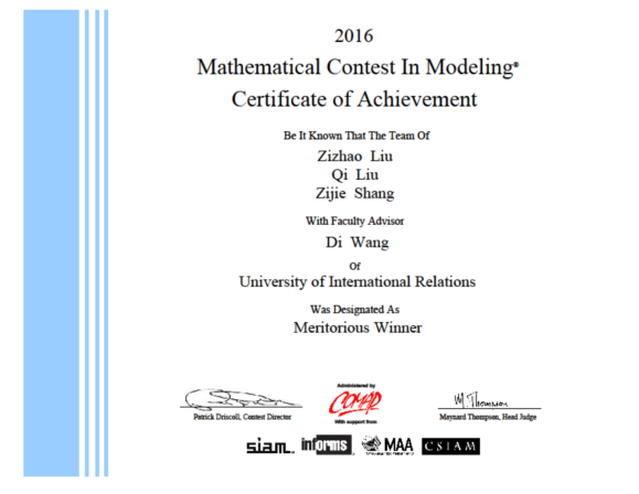 4月12日,2016年美国大学生数学建模竞赛(MCM/ICM)成绩在官方网站正式公布。我校获得了1个国际一等奖、5个国际二等奖、16个国际三等奖的好成绩!