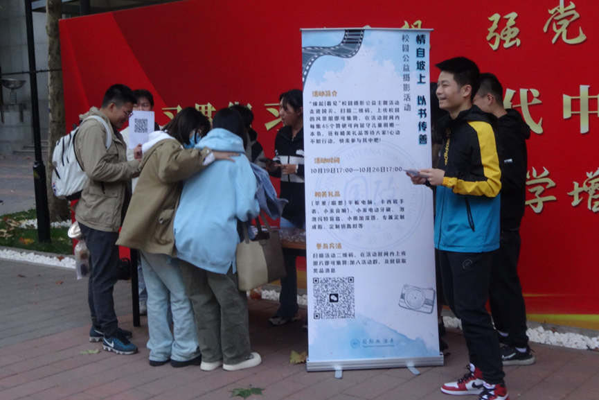 活动路展当天,日晖路上猛烈的秋风也吹不灭同学们为留守儿童们献上爱心的热情。UIRers纷纷按照“上传摄影作品,可以为小朋友捐赠书籍”的活动要求进行了现场报名,送出自己给留守儿童们的寄语,并将作品上传到平台,转发到朋友圈集赞。