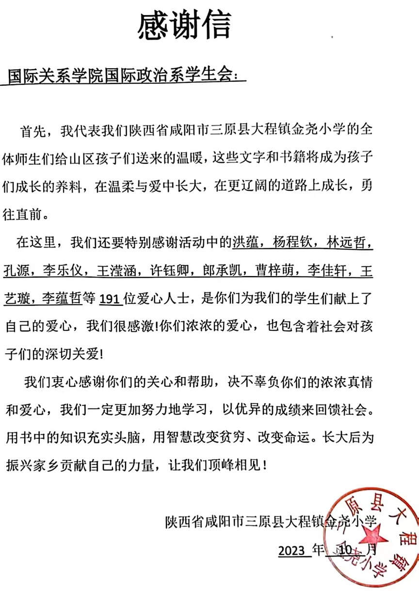 在国际政治系学生会与国关同学们的共同努力下,一句句祝福的话语跨越了大山大江的阻隔,送入留守儿童的耳朵里,也温暖了他们的心。除了199本书籍外,小朋友们还收到了铅笔、橡皮擦、练习本等学习用品,助力他们的学习!